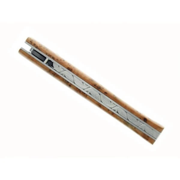 Les ateliers 1515 de Manu Laplace à Thiers produisent ce joli modèle semi-artisanal. Lame en acier noirci et oxydé 12C27 de 8.4 cm. Plein manche en bois de cade (genèvrier), liner lock. Entretoise guillochée à l’extérieur et à l’intérieur. Longueur totale 20.4cm. Livré avec un étui brun pour la poche.