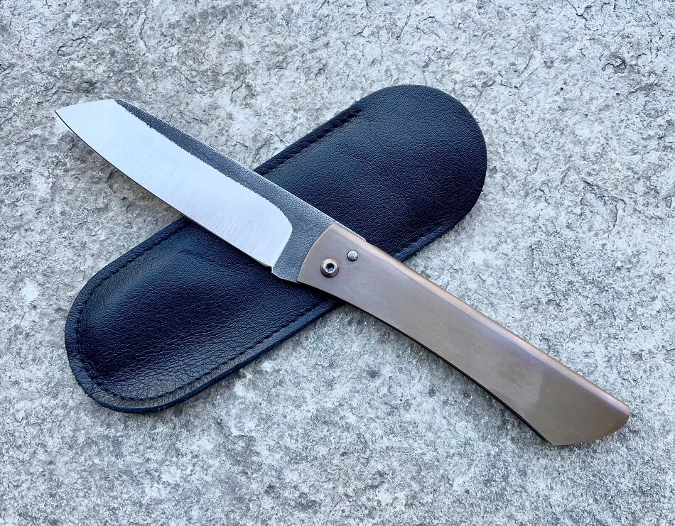 Couteau Abarca à friction en inox. Ce joli couteau pliant sait se faire discret dans la poche grâce à sa faible épaisseur (5.2mm) et son poids plume (65g.). Le manche est en acier inoxydable Z8 plié et patiné à chaud ce qui lui donne cette teinte gris/bleu. La friction de la lame peut être ajustée si nécessaire en agissant sur le serrage de l’axe vissé. La lame de 8.6cm. en acier inox N690Co est montée sur rondelles de friction en bronze. Longueur totale de 19.7cm. Fabriqué par un artisan dans le centre de Montpellier.