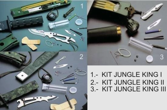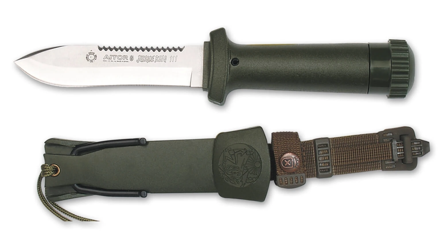 Couteau de survie avec accessoires (voir photo) dans le manche et dans l’étui couleur vert olive. Lame en acier inox de 10.7cm avec contretranchant denté sur les 2/3. Longueur totale 22cm.