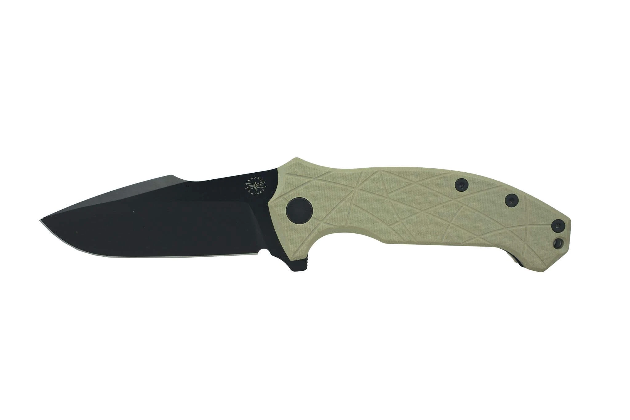 Lame de 10cm en acier semi-inox D2 avec coating noir. Ouverture par flipper. Roulement Ă billes. Manche en G10 coyote. Liner lock. Clip en acier inox noir. Longueur totale 23.8cm.