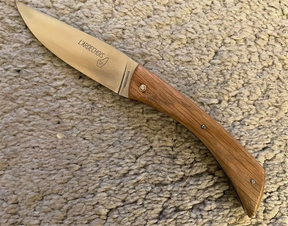 Couteau l’Ardèchois avec lame de 8.7cm en acier inox 12C27. Mitres en inox. Plaquettes en chêne vert. Ressort lisse. Cran forcé. Longueur totale 19cm. Ressort inox, Poids 80g. Créateur Jean-Jacques Astier.
