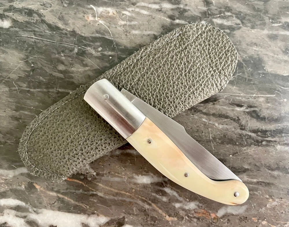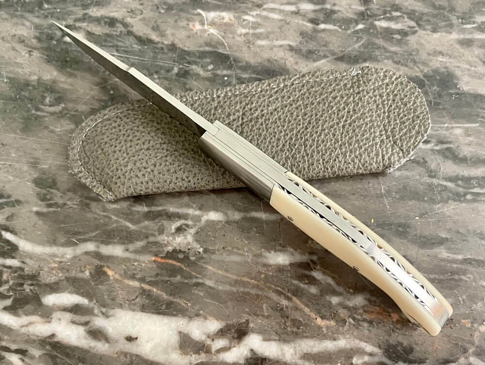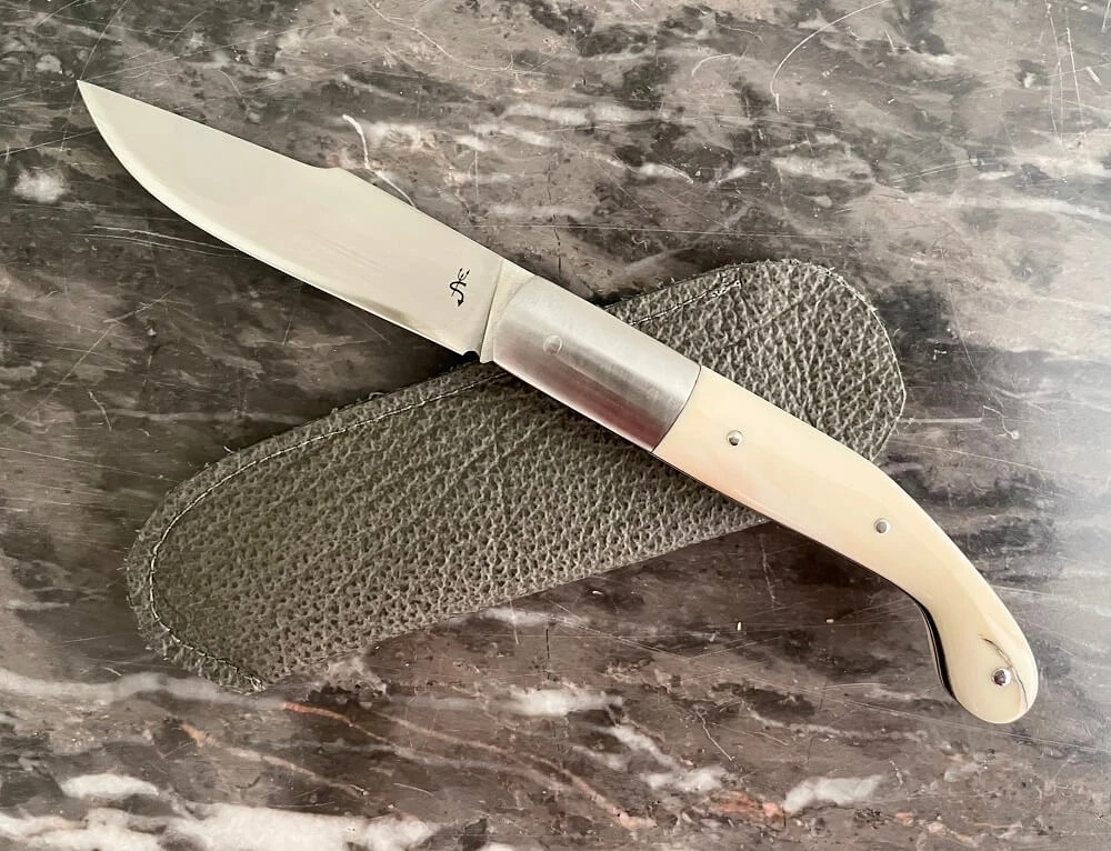 Couteau de Julien Baillon, modèle Yatagan. Lame en acier RWL34 de 8cm, satinée en long, tranchant poli. Mitres, platines guillochées et ressort en inox. Plaquettes rivées en dent de phacochère. Cran forcé. Longueur totale 18.2cm. Julien Baillon est un artisan du Languedoc, basé près de Montpellier.