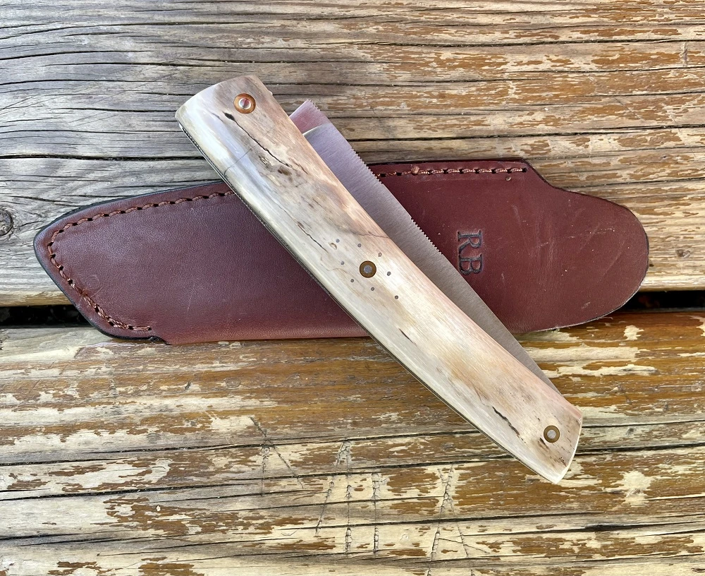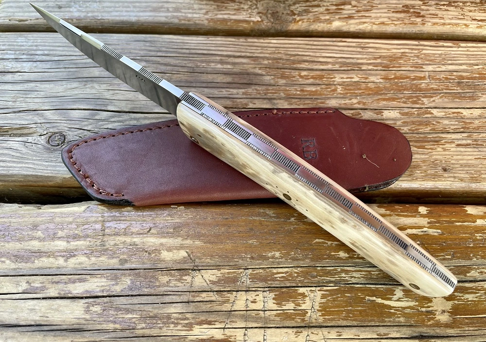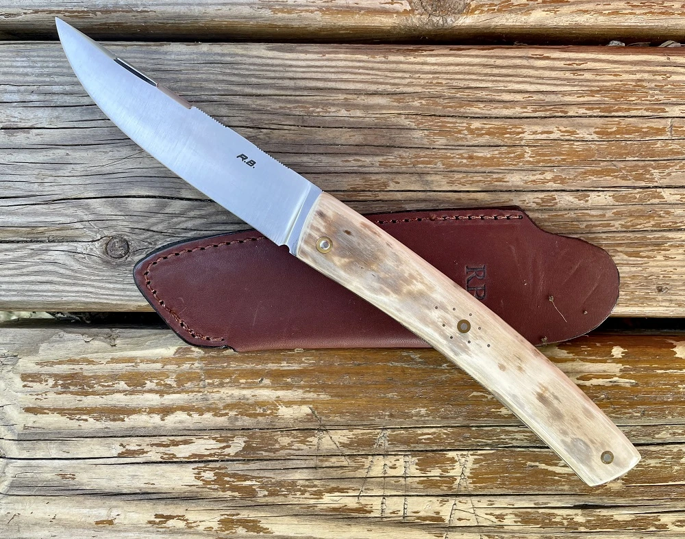 Couteau Thiers de Robert Beillonnet. Lame en acier inox RWL34 de 10.3cm, finition satinée avec onglet à la nogentaise. Manche avec de superbes plaquettes en ivoire de mammouth rivées avec rosaces en laiton. Platines et ressort inox guillochés. Cran forcé. Longueur totale 23cm. Etui en cuir avec logo RB. Robert Beillonnet dit le Gros est deux fois MOF (meilleur ouvrier de France) en 1997 et 2000. Son atelier se situe dans la région de Thiers. Ses modèles sont difficiles à obtenir et sa réputation de coutelier est très grande. Couteau de collection. Finition et ajustage parfaits. VENDU