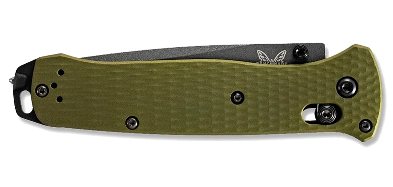 Couteau Benchmade Bailout 537SGY_1. Lame tanto semi-dentée de 8.6cm en acier CPM M4 avec ouverture 1 main ambidextre. Système Axis lock. Manche en aluminium couleur olive. Clip réversible Tip-up . Longueur totale 20.5cm. Poids 105g. Pommeau avec trou passe-lacet avec brise-vitre intégré.