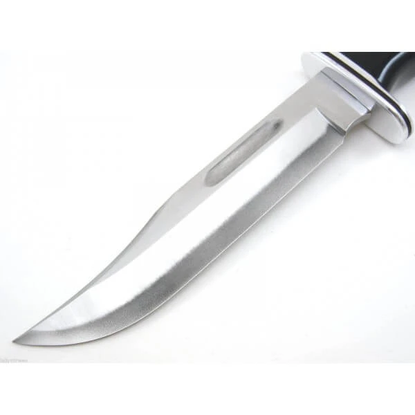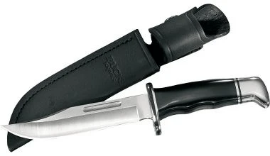 Couteau Buck 119. Lame de 15cm en acier 420HC facile à entretenir et à aiguiser. Manche en Phenolic (nylon). Garde et pommeau en inox. Etui en cuir noir pour la ceinture.