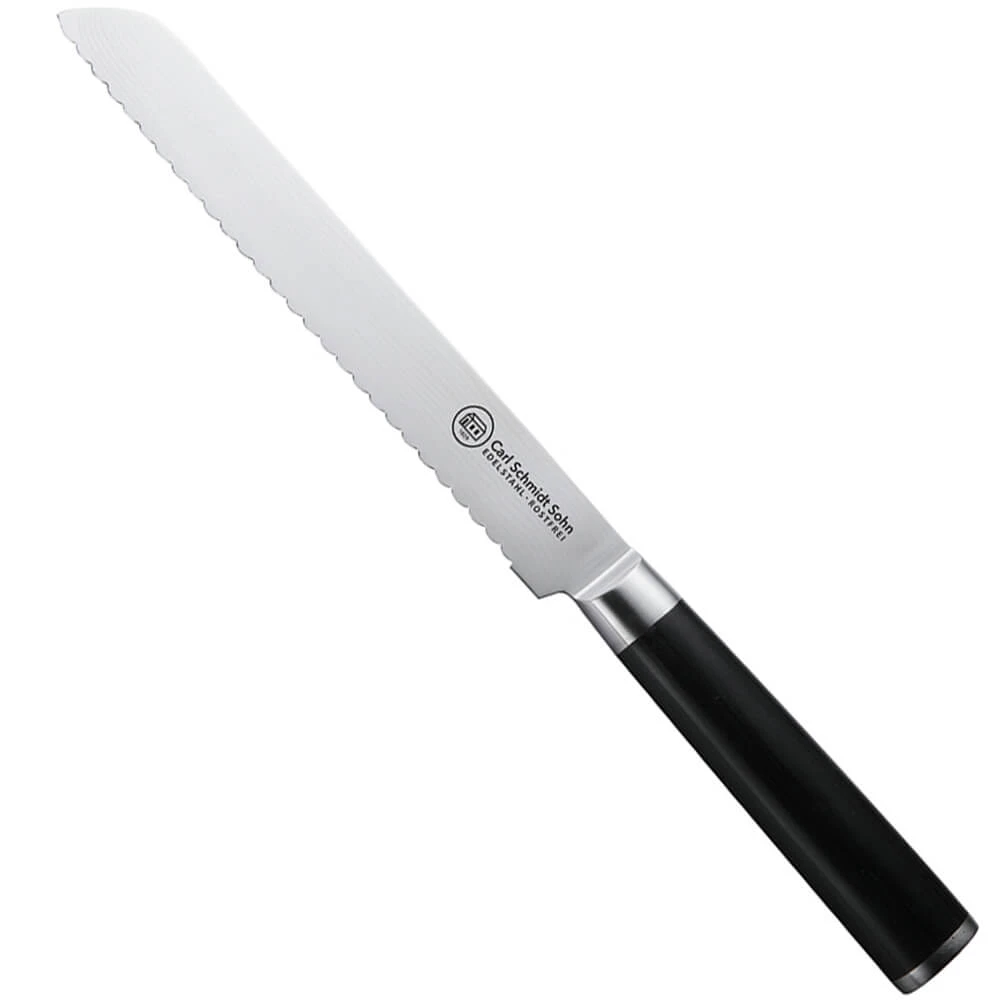 Couteau à pain Konstanz de 20cm en acier inox composé de 67 couches d’acier japonais et d’un coeur en VG10 d’une dureté d’environ 60HRC. Manche en bois de forme ergonomique, garde et pommeau en acier inox. Poids 400g. Produit à Solingen par la société Carl Schmidt Sohn basée en Allemagne depuis 1829.