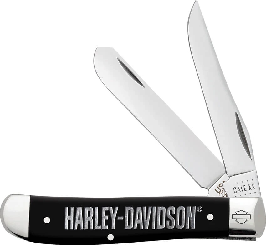 Couteau Case Harley Davidson mini Trapper smooth. Modèle 2207 SS. 8.9cm fermé. Lames clip et Spey en acier inoxydable. Manche synthétique noir. Mitres en maillechort avec logo HD. Sur le manche inscription Harley Davidson. Livré en boîte.