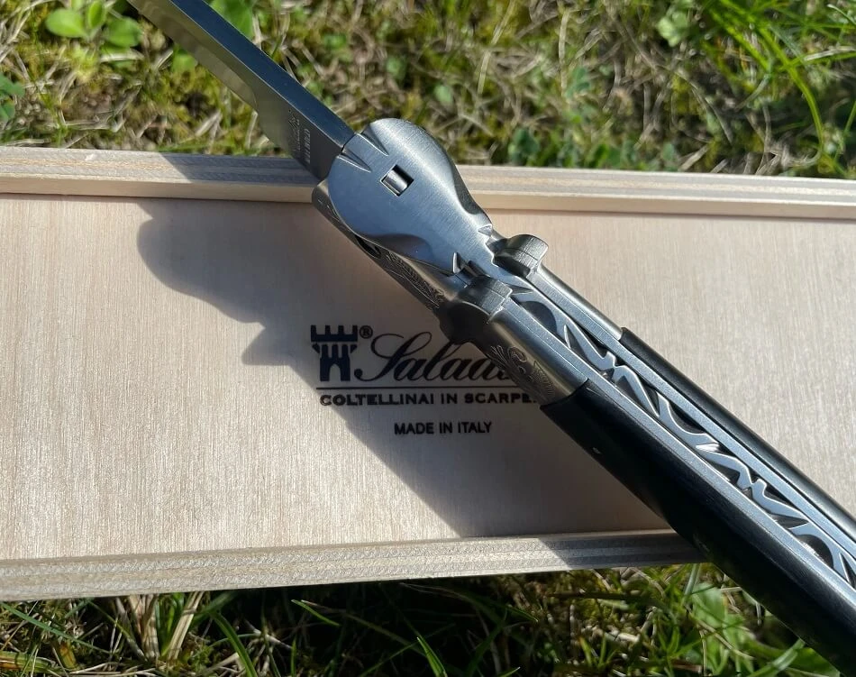 Coltellerie Saladini modèle Passatore. Lame en acier ma5mv, ressort avec verrou pour la lame en acier inoxydable décoré à la main.
