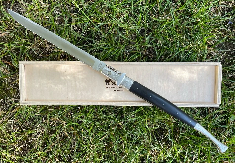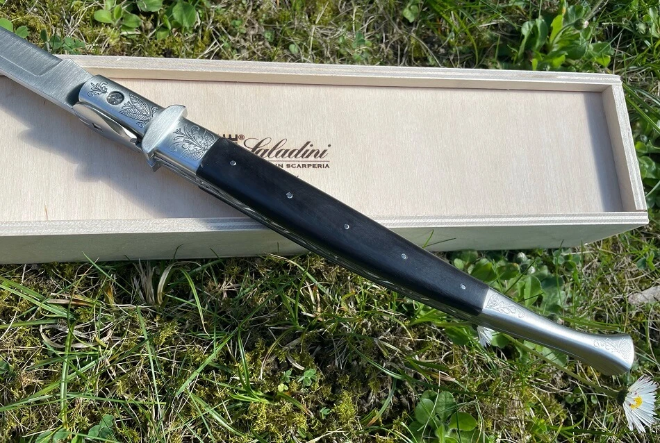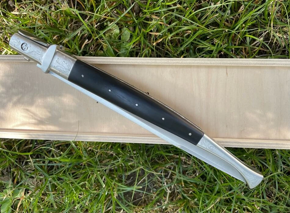 Manche avec mitres gravées à la main en acier inoxydable aisi 304, plaquettes en corne de buffle noire flammée. Longueur totale : 44 cm. Longueur de la lame : 21 cm. Modèle de grande taille entièrement réalisé à la main dans les ateliers de la coutellerie Saladini à Scarperia au nord de Florence.