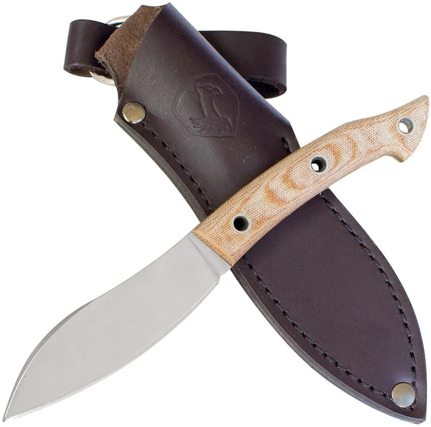 La forme ondulée et large de la lame attire immédiatement les regards. Cette forme est caractéristique du style Nessmuk. Ce type de couteau est principalement utilisé pour l’éviscération du gibier et la préparation de la nourriture.