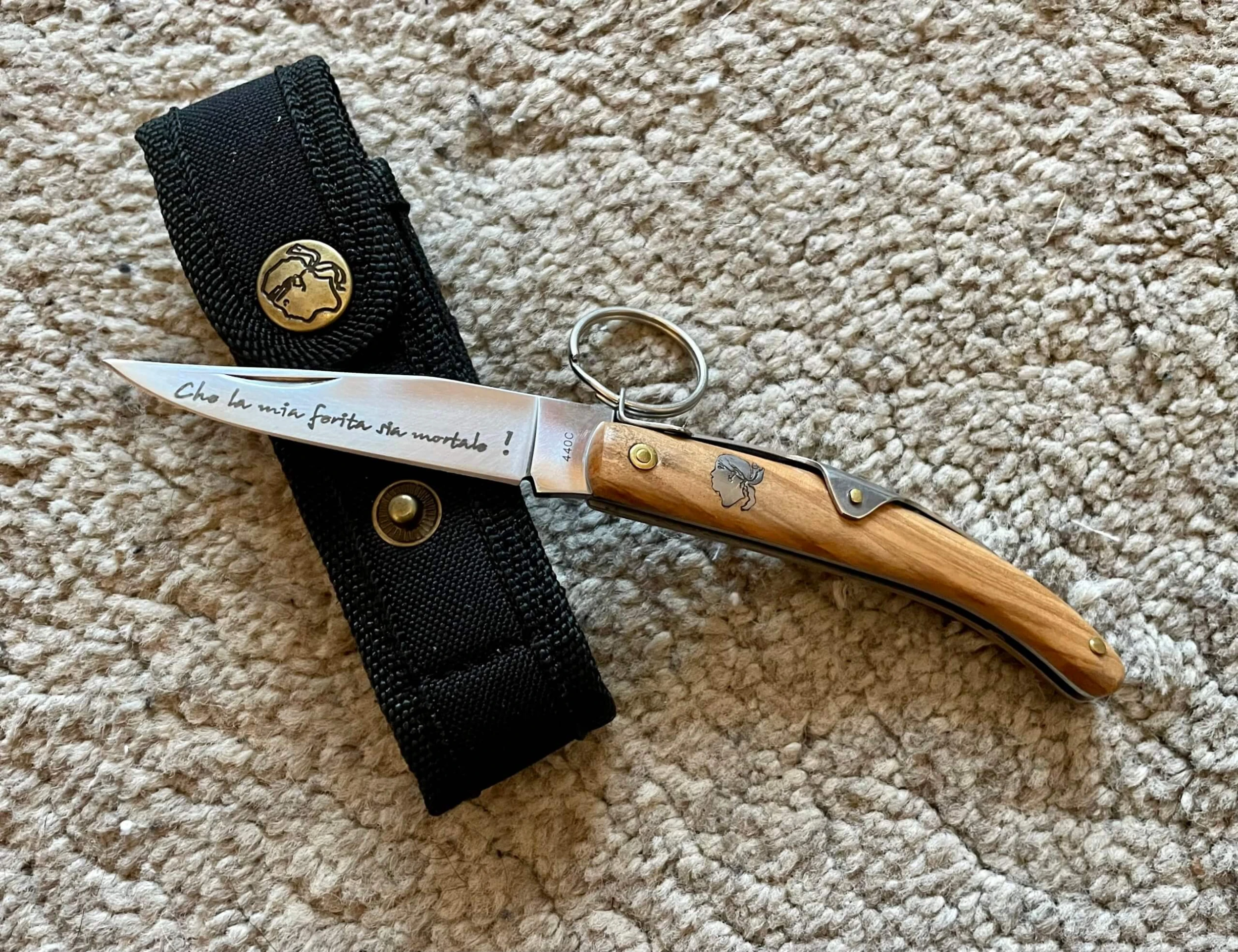 Corse à anneau olivier 9cm. Lame en acier inox 440C avec inscription au laser. Manche en olivier avec incrustation tête Corse. Système de verrouillage à palme. Longueur fermé 9cm. Longueur totale 16.6cm. Livré avec étui de ceinture en nylon.