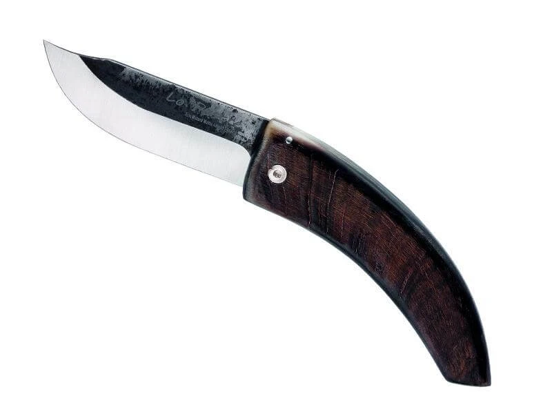 Couteau avec lame en acier carbone de 8.5cm façon semi-brut de forge. Plein manche corne de chèvre. Système de type 2 clous (pas de cran d’arrêt) avec axe central réglable. Longueur totale 20.6cm. La couleur de la corne peut légèrement varier selon les modèles.