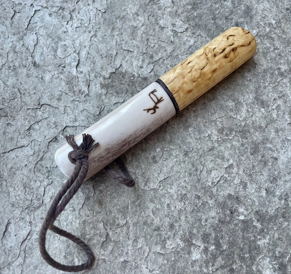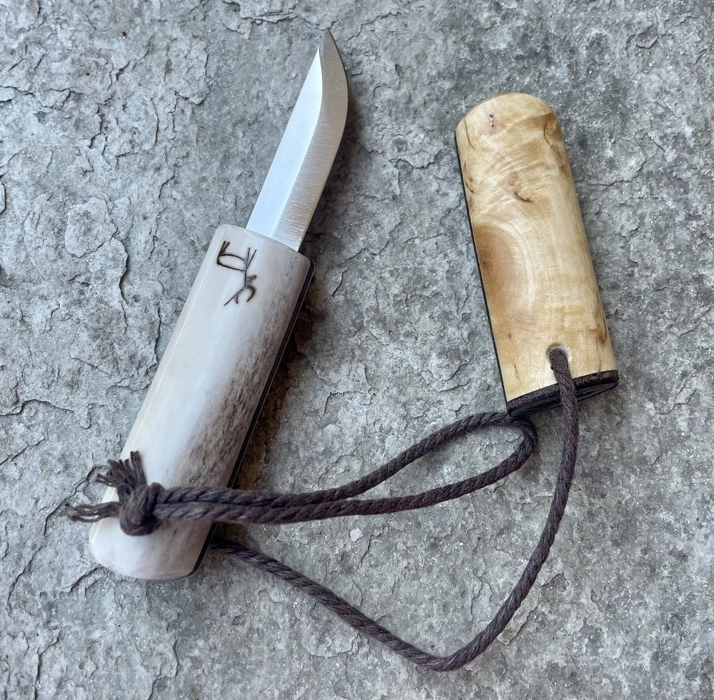 Couteau nordique mini Tör renne bouleau. Lame en acier inox de 5.6cm. Manche en bois de renne. Etui cache lame en bouleau frisé tenu par un cordon. Longueur totale 13.5cm. Petit couteau droit pour la poche. Poids 62g.