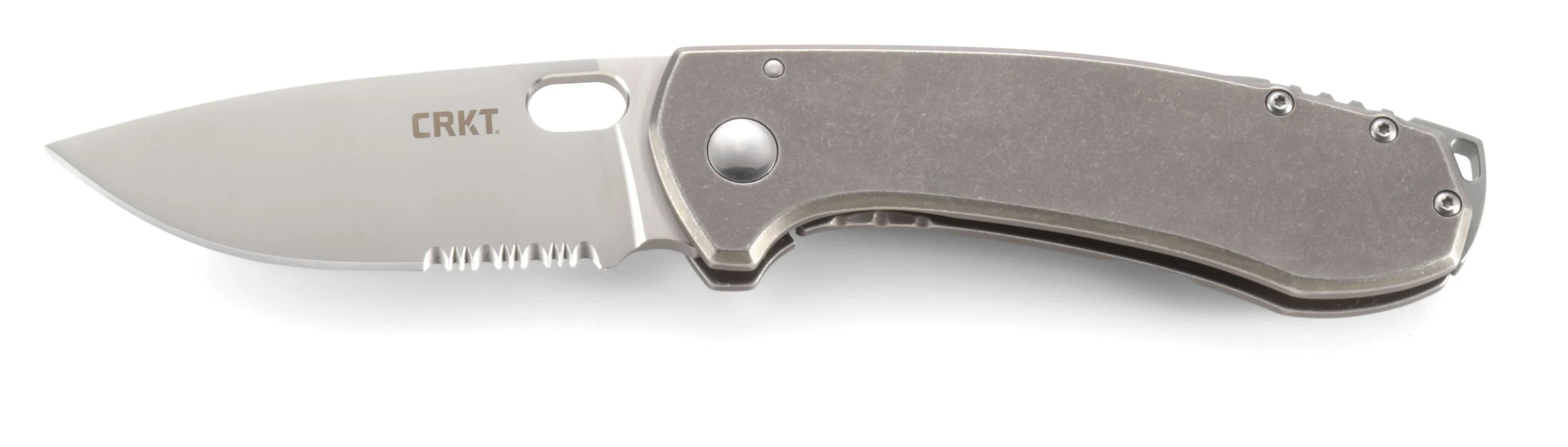 Lame drop point partiellement dentée de 8.7cm. en acier inox 8Cr13MoV finition satinée, épaisseur 3.9mm. Manche en acier inox satiné. Frame lock. Clip inox(possiblité up et down). Longueur totale 20.6cm.