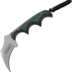 Couteau CRKT Keramin Minimalist. Couteau de cou avec lame hawkbill de 5cm en acier. 5CR15Mov et plaquettes en micarta vert/noir. Etui en GRN. Lanyard. Longueur totale 12.2cm.