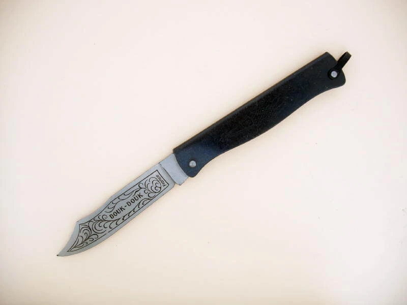 lame en acier carbone, cran forcé, manche en tôle repliée, bélière. 200mm.
