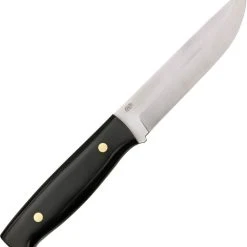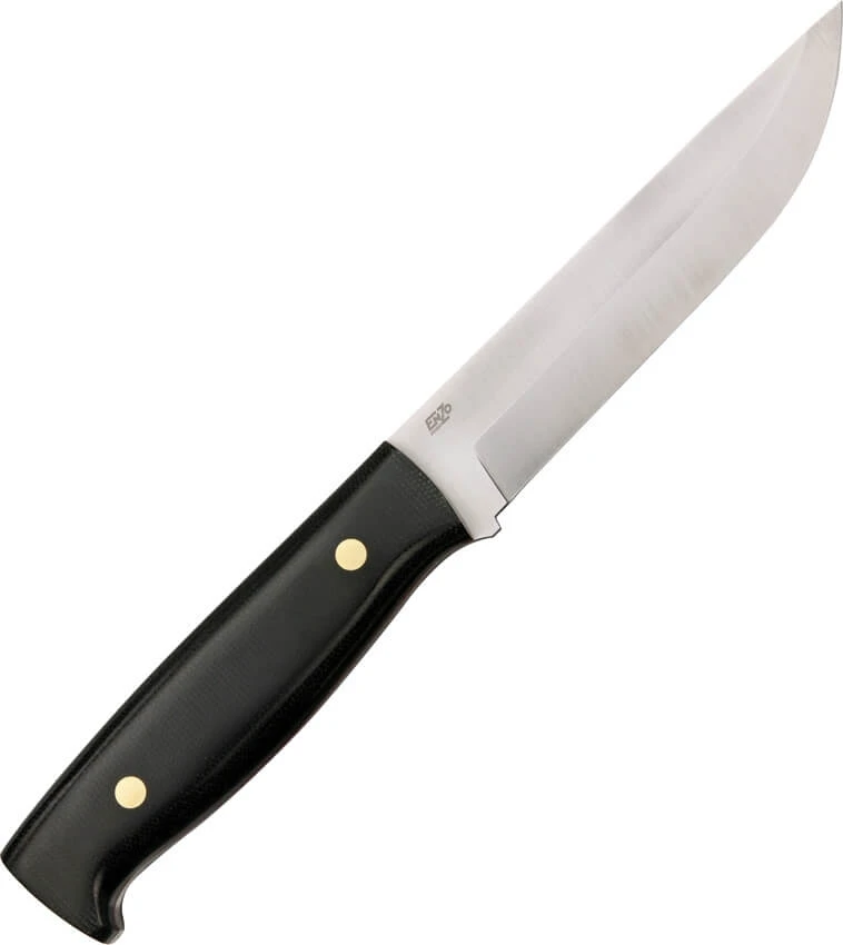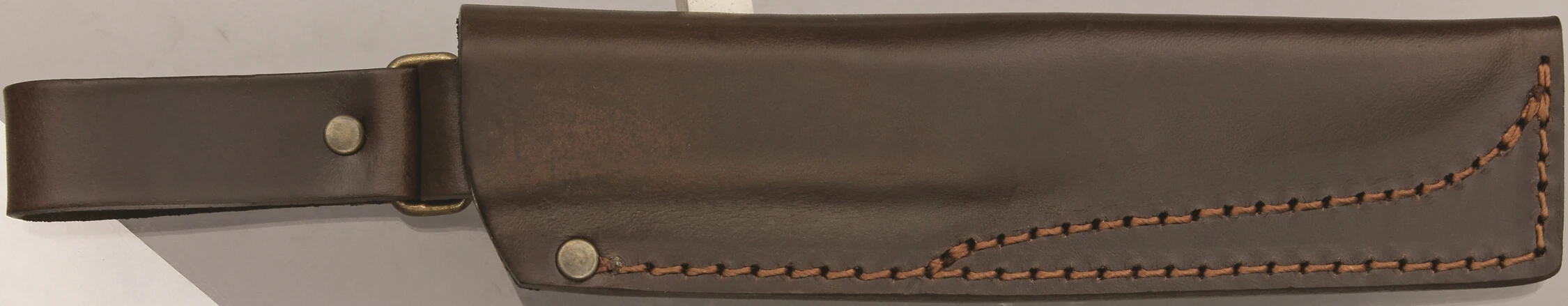Enzo knives Camper 125 avec lame en acier semi-inox D2 tool de 125mm, émouture en V prononcé sur le fil (Scandi grind zero avec micro biseau). Full tang. Plaquettes rivées en micarta canvas noir avec lignes intercalaires rouges. Etui en cuir argentin marron avec port pour la ceinture. Longueur totale 235mm. Produit par la maison Brisa en Finlande.