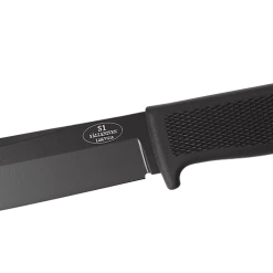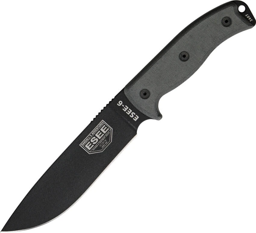 Couteau ESEE 6 lame lisse noire étui sable. Lame lisse de 16.4cm en acier 1095 avec traitement noir sur la lame. Manche en micarta linen noir. longueur totale 29.6cm. Etui en plastique moulé de couleur olive avec fixation au dos d’une plaque noire à visser munie d’un clip.