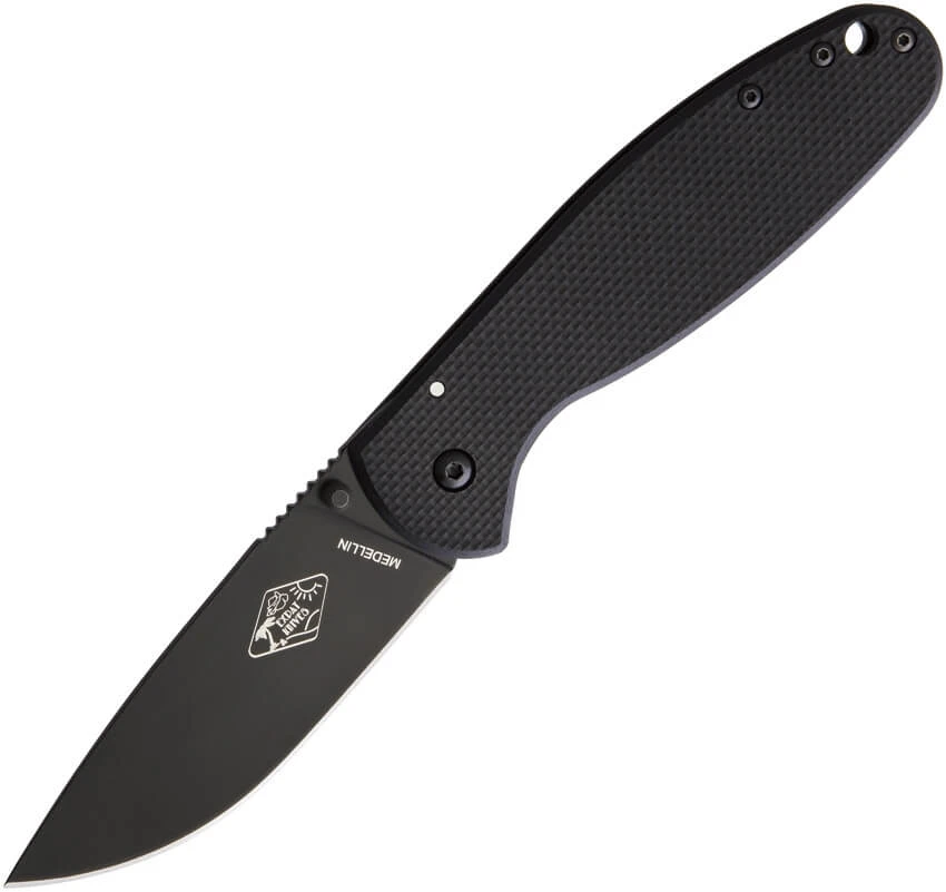 Esee Expat Medellin avec lame drop point, coating EDP noir en acier inox AUS-8 de 9cm avec ergot D/G. Manche en G10 noir côté recto et en acier avec coating noir côté verso. Cran intégral en ligne. Longueur totale 21.5cm. Clip.