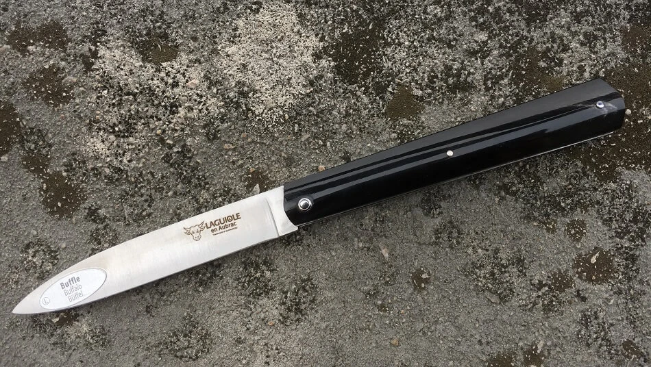 Couteau réalisé par Laguiole en Aubrac à Espalion qui est un jolie bourgade de la vallée de l’Olt en Aubrac à 20km de Laguiole. Lame en acier inox satinée de 9.5cm, plein manche en corne de buffle. Cran forcé. Longueur totale 19.6cm.