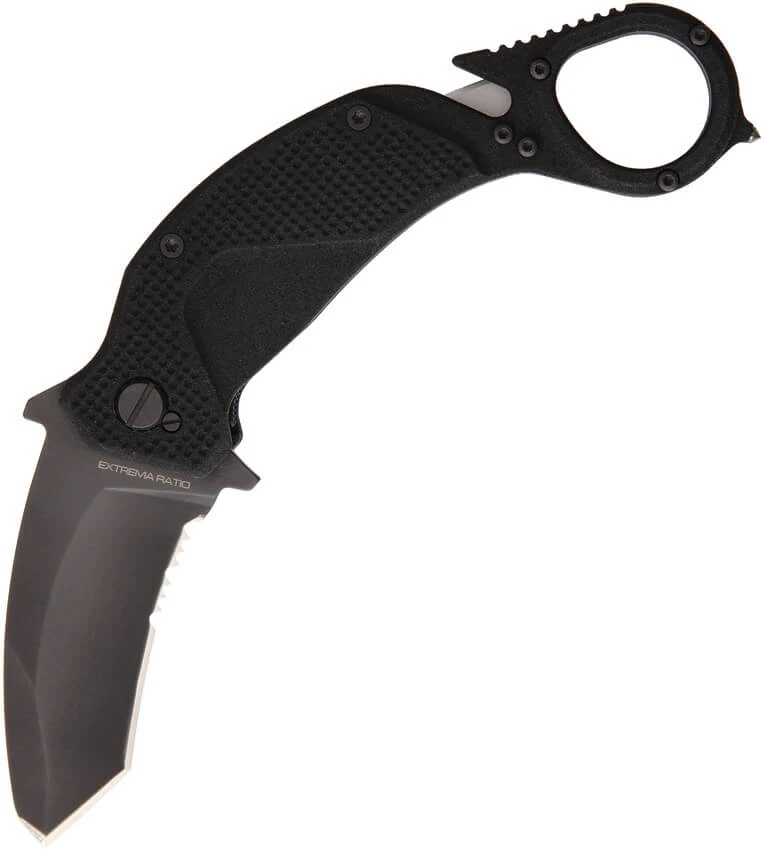 Couteau Extrema Ratio Nightmare avec lame noire recourbée semi-dentée de 7.6cm en acier Bohler N690 inoxydable. Poignées noires en aluminium anodisé anticorodal. Longueur totale 19.8cm.