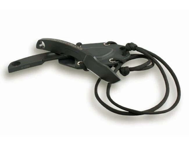 Lame de 4cm en acier inox N690 (58 HRC). Manche d’une pièce avec la lame avec le même acier. Longueur totale 129mm. Etui en kydex moulé avec paracorde.