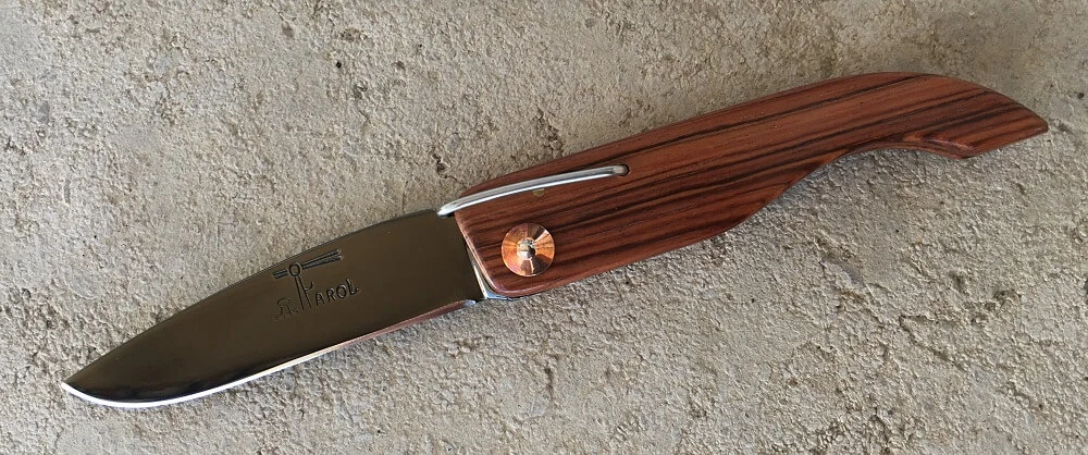 Lame noire HDS (traitement du surface qui durcit la lame et la rend quasi inrayable) de 7.9cm en acier inox. Manche en palissandre. SystĂšme de cran âpince Ă lingeâ. FabriquĂ© artisanalement par une petite sociĂ©tĂ© de La Rochelle.