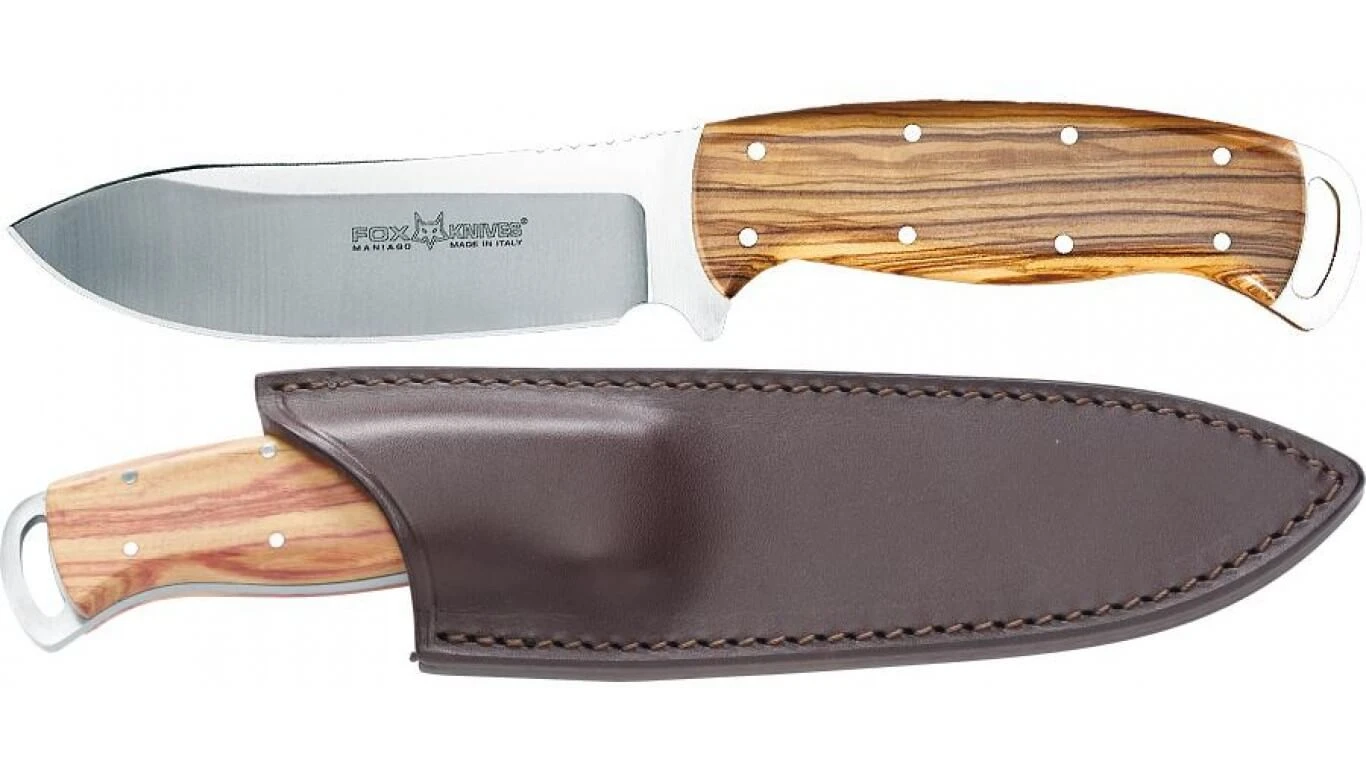 Couteau fabriqué à Maniago en Italie. Lame inox de 11.5cm en acier inox N690Co. Manche plate semelle rivé en olivier. Passe-lacets. Etui en cuir marron pour la ceinture. Longueur totale 23.2cm. Design par Pachi un grand nom de la coutellerie italienne.