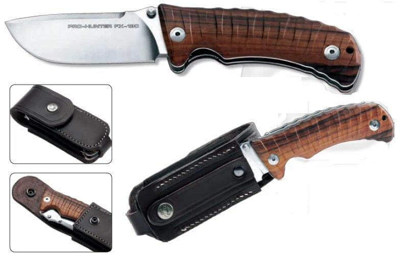 Couteau Fox Pro Hunter avec lame drop point de 9.5cm en acier N690co à cran liner avec ergot. Double sécurité (liner lock et blocage par un bouton poussoir). Manche de 12cm en bois de fer. Etui permettant le port fermé ou ouvert de la lame. Un très joli et pratique couteau de chasse.