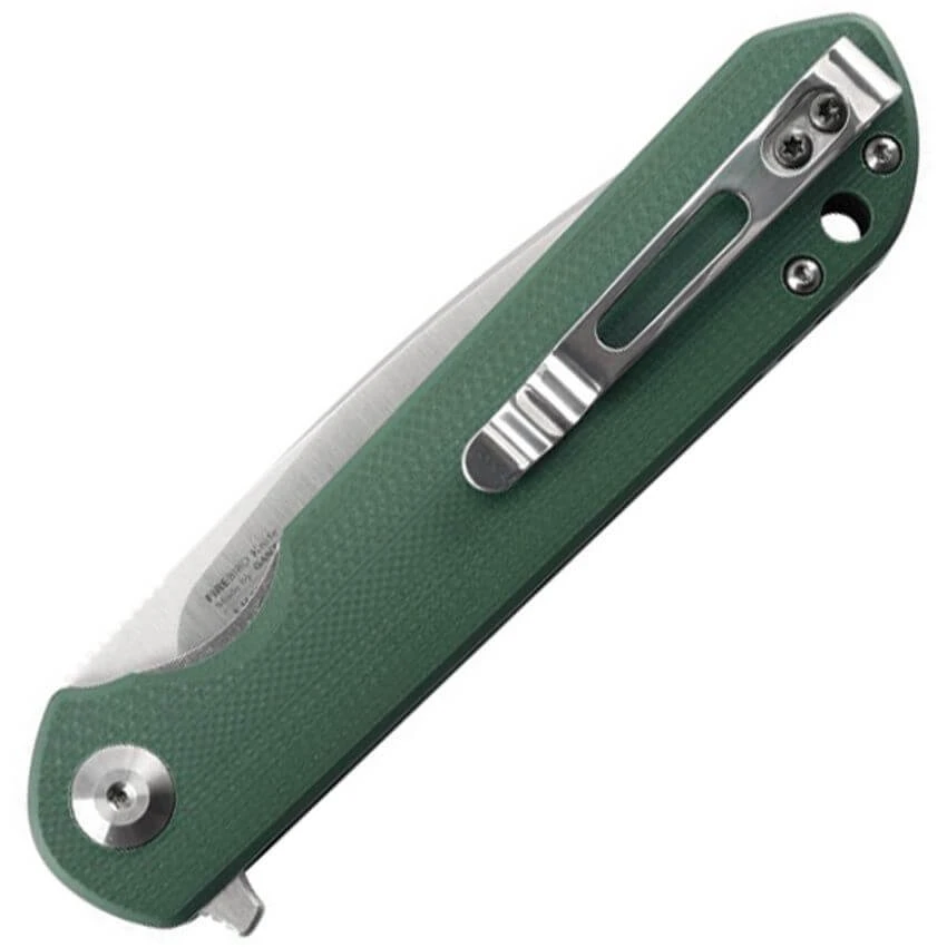Couteau Ganzo Firebird FH41GB. 4,5″ Longueur fermé 11,43 cm. Lame spear point finition satinée en acier semi-inox D2 satiné de 8,89 cm. Manche en G10 vert. Soie allongée avec ouverture par flipper (bille de rétention). Liner lock. Trou pour une lanière. Clip de poche. Livré en boîte.