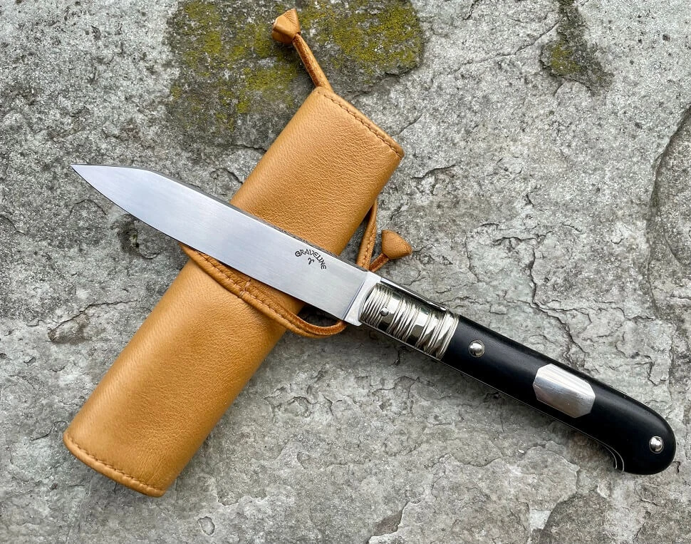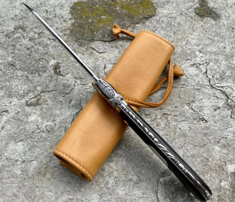 Couteau de Pascal et Isabelle Graveline, modèle Némours. Lame de 10.2cm en acier RWL34 avec gravure sur le dos. Manche avec plaquettes en ébène rivées. Plaquette en argent à graver côté recto. Ressort forgé entièrement gravé à la main par Isabelle. Mitre centrale en maillechort. Cran forcé. Longueur totale 22.3cm. Poids 100g. Couteau réalisé par un MOF (meilleur ouvrier de France), l’atelier Graveline fait partie des membres des grands ateliers de France et est considérée comme entreprise du patrimoine vivant.