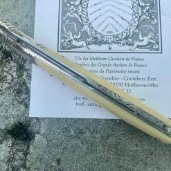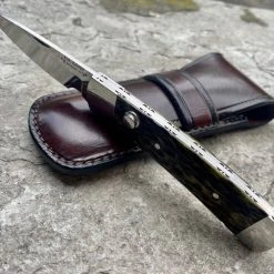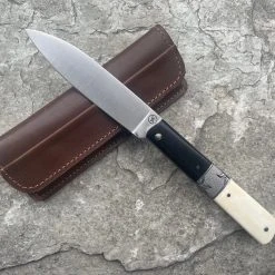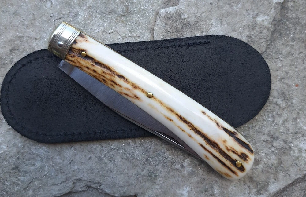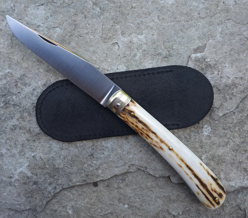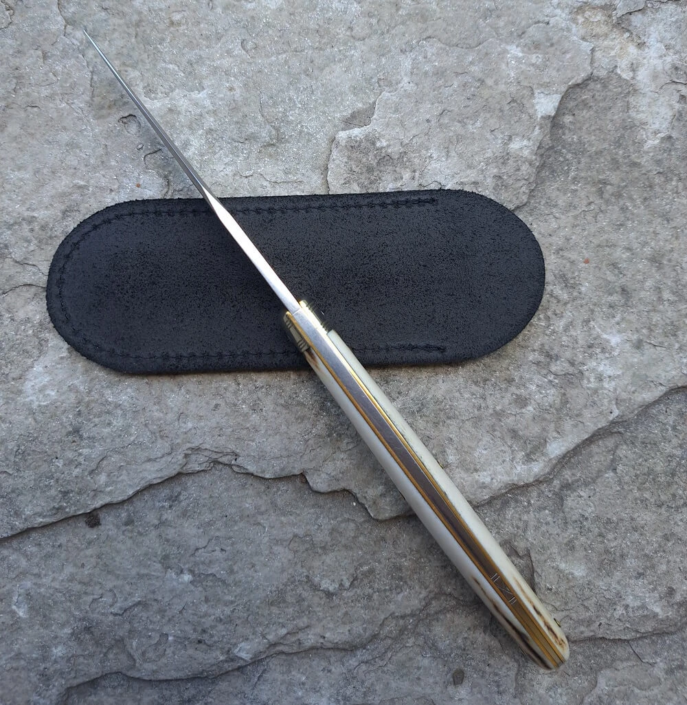 Couteau de Mathiez Herrero Jacknife cerf. Lame de 9.2cm en acier carbone XC100. Système de fermeture à cran forcé. Platines et mitres en maillechort, cotes en bois de cerf. Ressort en acier inoxydable Z20Cr13. Longueur totale: 202 mm. Longueur manche: 110mm. Poids: 70g.