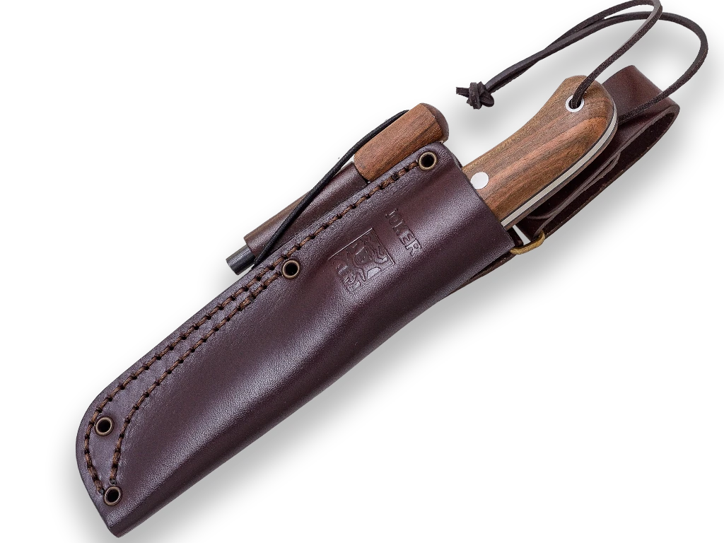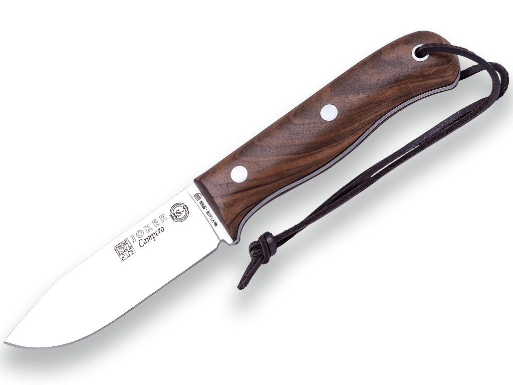 Couteau de chasse Joker avec lame skinner scandi full tang en acier inoxydable 1.4116 (MoVa) de 100 mm, épaisseur 3,5 mm. Longueur totale: 220 mm. Poignée en bois de noyer avec intercalaires en fibre noire. Poids: 155 grs. Etui en cuir marron (deux positions de hauteur pour le port) avec emplacement pour firesteel avec poignée noyer assortie au manche du couteau. Fabriqué en Espagne. La teinte du bois peut varier légèrement selon les modèles.
