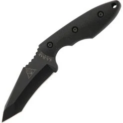 Couteau Ka-bar TDI Hinderer Hell Fire avec lame recourbée et pointe renforcée de 9cm. finition noire en acier 1095 cro-Van tanto. Full tang. Poignées Zytel noires. Trou pour une lanière. Gaine en nylon noir avec bouton pour dégager le couteau et clip en métal . Longueur totale de 18.5cm.
