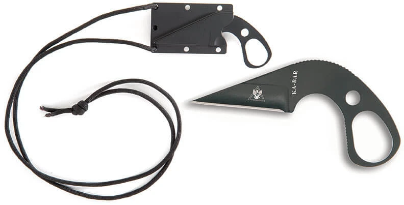 Couteau Ka-bar last ditch squelette avec lame noircie en acier inox 9Cr18 de 4,2 cm. Etui cou en plastique.