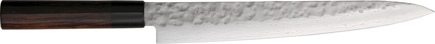 Lame avec tranchant en acier 19C27 entouré de damas 45 couches de 25cm. Manche en red Sandalwood. Idéal pour les filets ou couper de fines tranches.