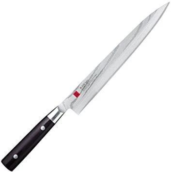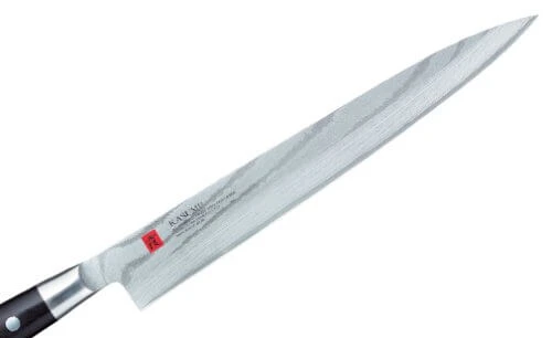 Les feuilles de damas qui insèrent au cente un acier VG10 de 61 HRC confèrent au couteau Kasumi un caractère très haut de gamme. Ainsi, chacun des couteaux devient un pièce incomparable, née de l’art artisanal, de la technique et du design. Lame de 24cm. Couteau à sashimi.