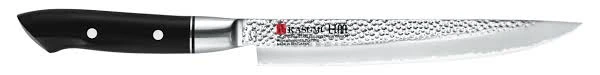 Lame en acier damas VG-10 cobalt high carbon (60 HRC) de 20cm. La partie martelée est en acier inox 410. Manche en résine polyactel (POM) qui respecte les normes de confort et d’hygiène, ainsi qu’une durabilité excellente. Fabriqué au Japon selon des critères haut de gamme. Couteau à découper.