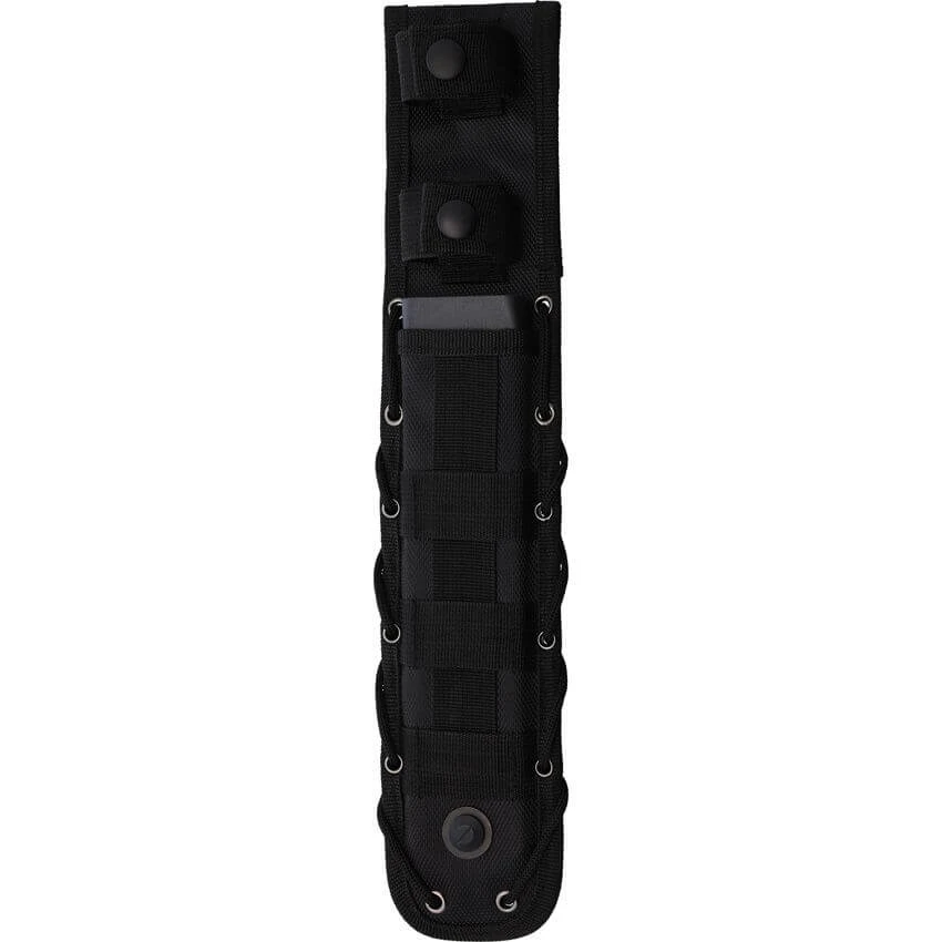 Couteau Kizlyar Survivalist X D2. Couteau fabriqué en Russie. Lame de 19cm. en acier semi-inox D2 en finition TacWash avec règle en pouces et centimètres côté verso. Manche full tang étendu d’une pointe de frappe à l’arrière. Trous d’arrimage. Plaquettes vissée en G10 vert. Longueur totale de 33cm. Etui en nylon de couleur camo avec coque en dur permettant l’attache du couteau pour port à droite ou à gauche, compatible MOLLE.
