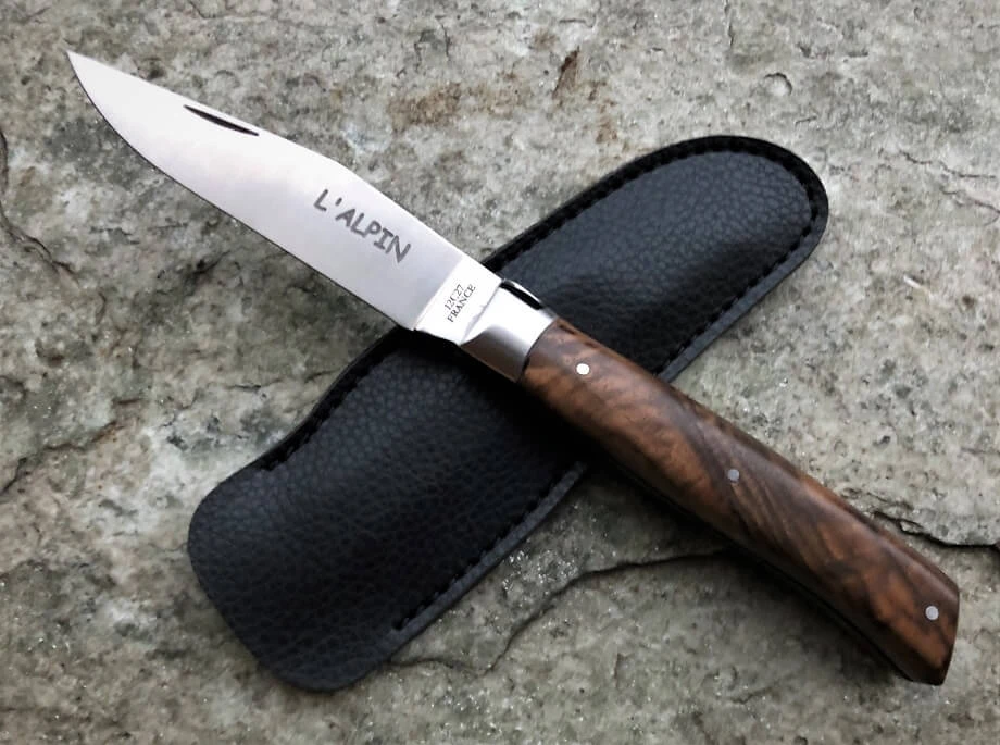 Couteau L’Alpin Laguiole Village noyer. Lame de 9cm en acier inox 12C27, manche de 10 cm en noyer, mitre inox. Cran forcé. Décor edelweiss sur la mouche.