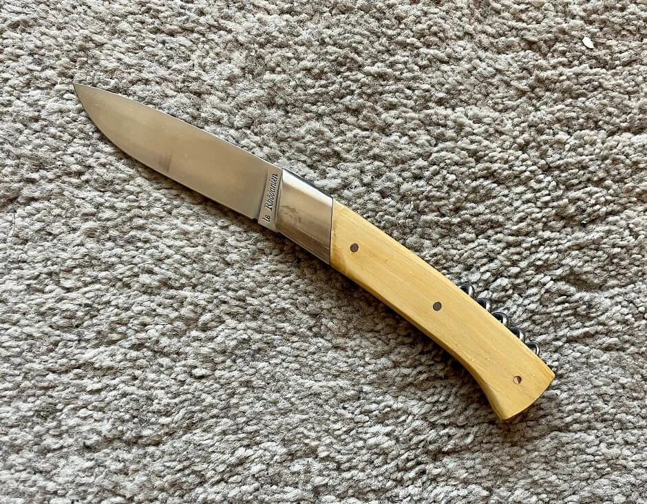 Couteau Le Rhôdanien buis tire-bouchon. Lame en acier 12C27 de 8cm. Mitre en acier inox brossé. Manche en buis. Tire-bouchon. Longueur totale 19cm. Couteau de la région de la Drôme.