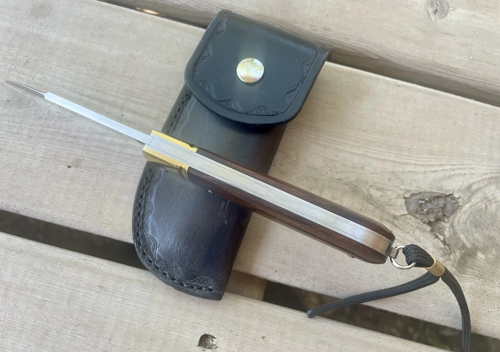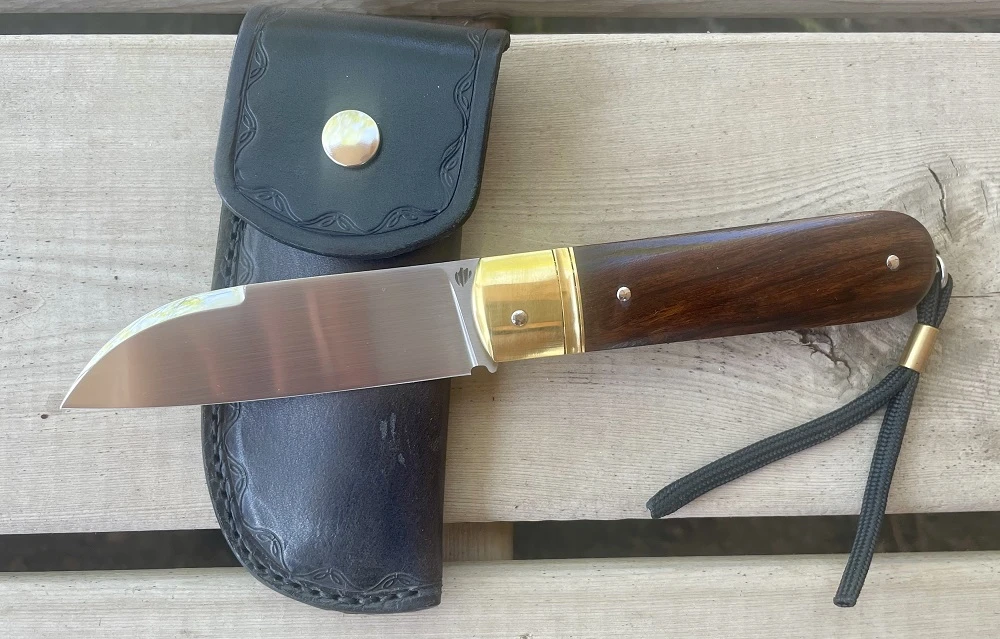 Canif de Philippe Lemonnier Philippe modèle Gouttière Jumbo 105. Lame de 8.6cm en acier inox RWL34 avec contre tranchant. Mitres en laiton. Manche avec plaquettes en bois de fer de l’Arizona rivées. Ressort et platines en inox. Cran forcé. Intercalaire en micarta avec anneau passe-lacet. Longueur totale 19.2cm. Etui pou la poche en cuir.