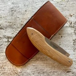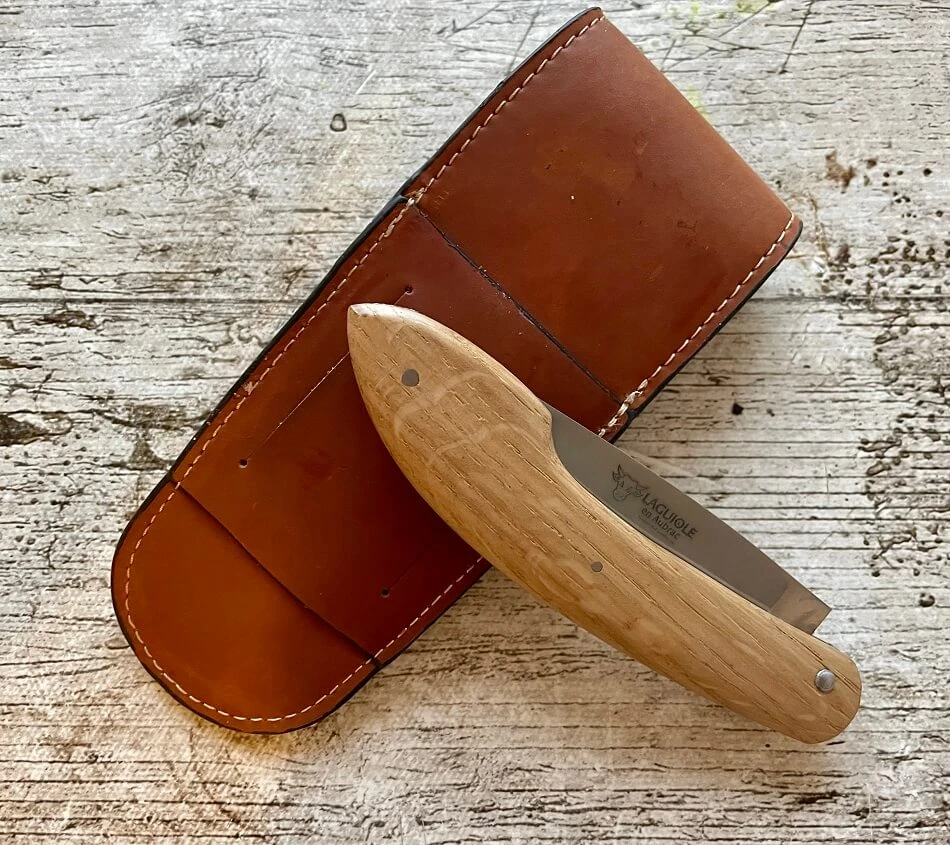 Couteau Les 3 évêques Chêne. Lame en acier inoxydable 12C27 de 9.7cm. Plein manche en chêne. Longueur totale 22.4cm. Poids 128g. Système de fermeture par cran forcé. Couteau de poche livré avec un étui cuir avec passant pour la ceinture et port vertical ou horizontal . Produit par Laguiole en Aubrac.