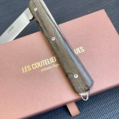 Les couteliers basques modèle Alios. Lame de 9.5cm en acier inox 14C28N. Plaquettes vissées en morta (bois en cours de fossilisation provenant du chêne qui se trouve dans le parc naturel de Brière). Couteau avec système spécial de cran à bascule en faisant pivoter l’anneau à l’arrière du couteau. Longueur totale 21.7cm (hors anneau). Livré en coffret avec certificat.