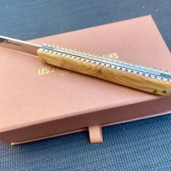Les couteliers basques modèle Artzaina. Lame de 9.5cm en acier inox 12C27, finition satinée. Manche avec plaquettes rivées en olivier. Cran forcé. Longueur totale 20.5cm. Anneau passe-lacet. Modèle inspiré de la makila, célèbre bâton de berger basque. Livré en coffret avec certificat.