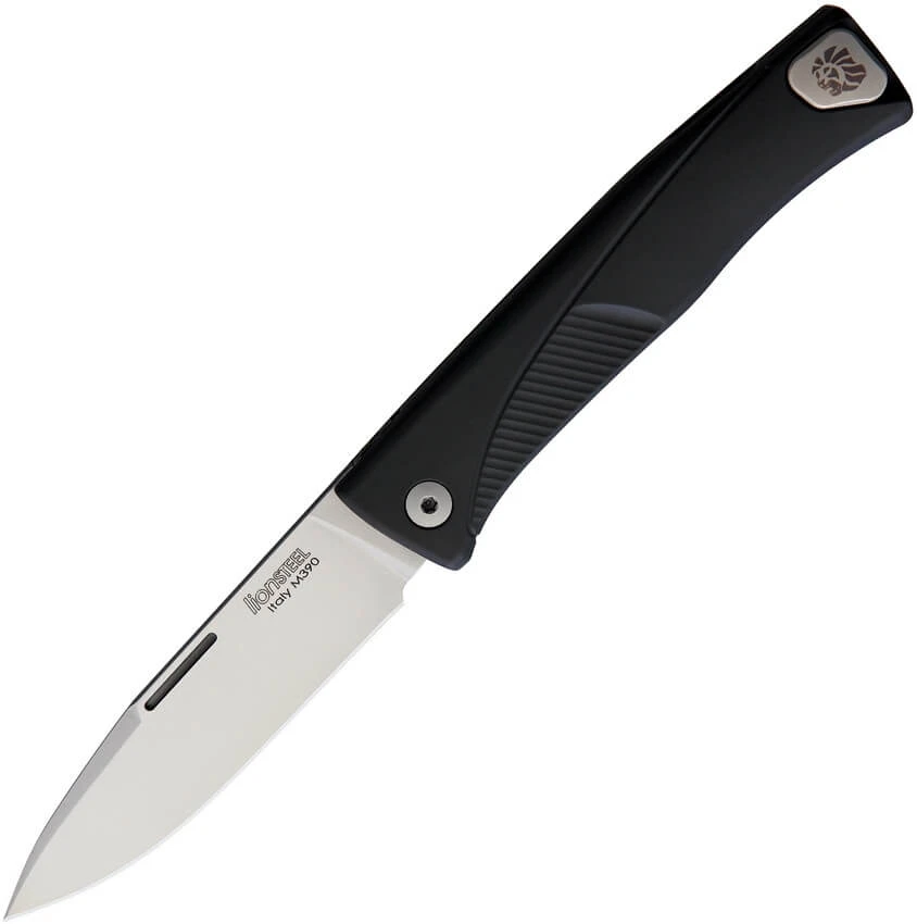 Couteau Lion Steel Thrill Solid. Lame de 8cm. en acier inox M390. Poignées en alu noir. Cran forcé carré. Système de clip rétractable à flan du manche en inox. Longueur totale 17.8cm. Made in Italy.