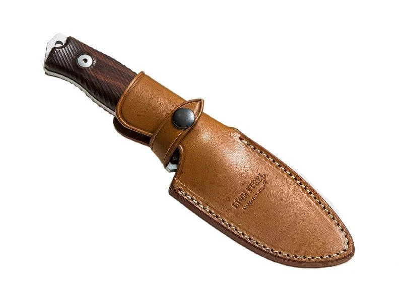 Couteau Lionsteel Poignard M5 santos. Lame de 11,5 cm en acier inox Sleipner satiné. Manche avec plaquettes en bois de santos. Soie traversante avec trou passe-lacet au pommeau (pommeau de frappe). Etui cuir marron. Longueur totale 24cm. Poids 198g (sans l’étui).