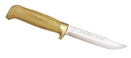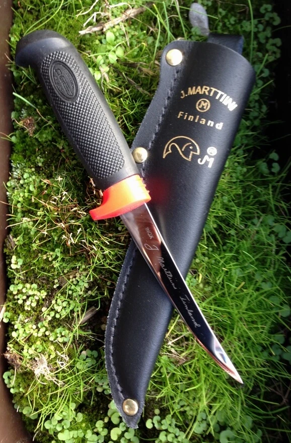 Lame souple de 9.4cm en acier inox. Garde en plastique rouge, manche en kraton. Etui cuir noir cousu et cloué. Longueur totale 19.2cm. Produit en Finlande. Idéal pour lever les filets de perche.