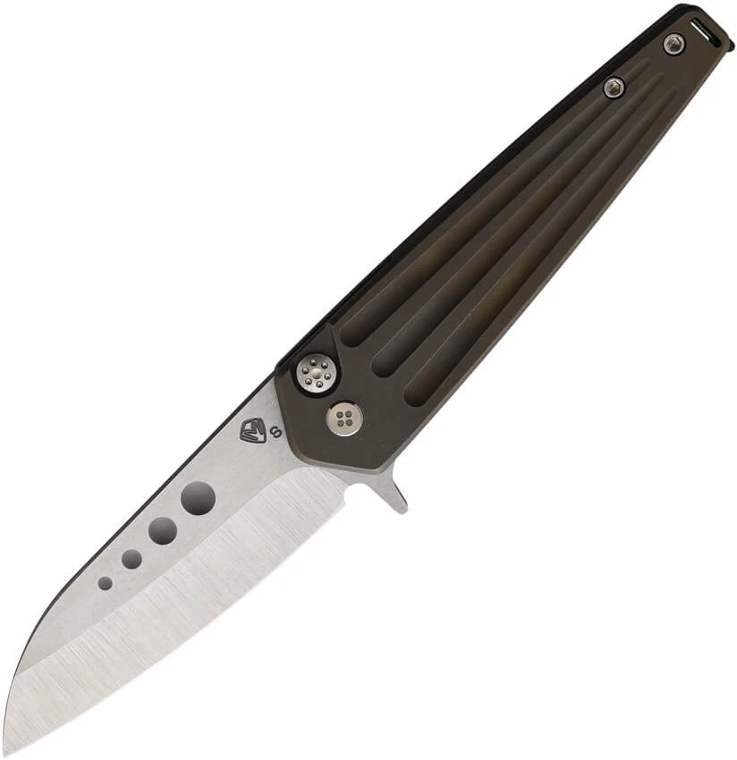 Medford Nosferatu. 12,1 cm. fermé. Lame de 9.5cm. en acier inoxydable S35VN satiné. Manche en titane finition bronze. Ouverture par flipper. Button lock. Trou pour une lanière. Clip de poche. Longueur totale 21.3cm. Livré en coffret étanche.