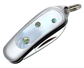 Lame de 2.8 cm à cran forcé. Manche inox avec insert en nacre/abalone. Très joli petit pendentif avec cuir de protection.